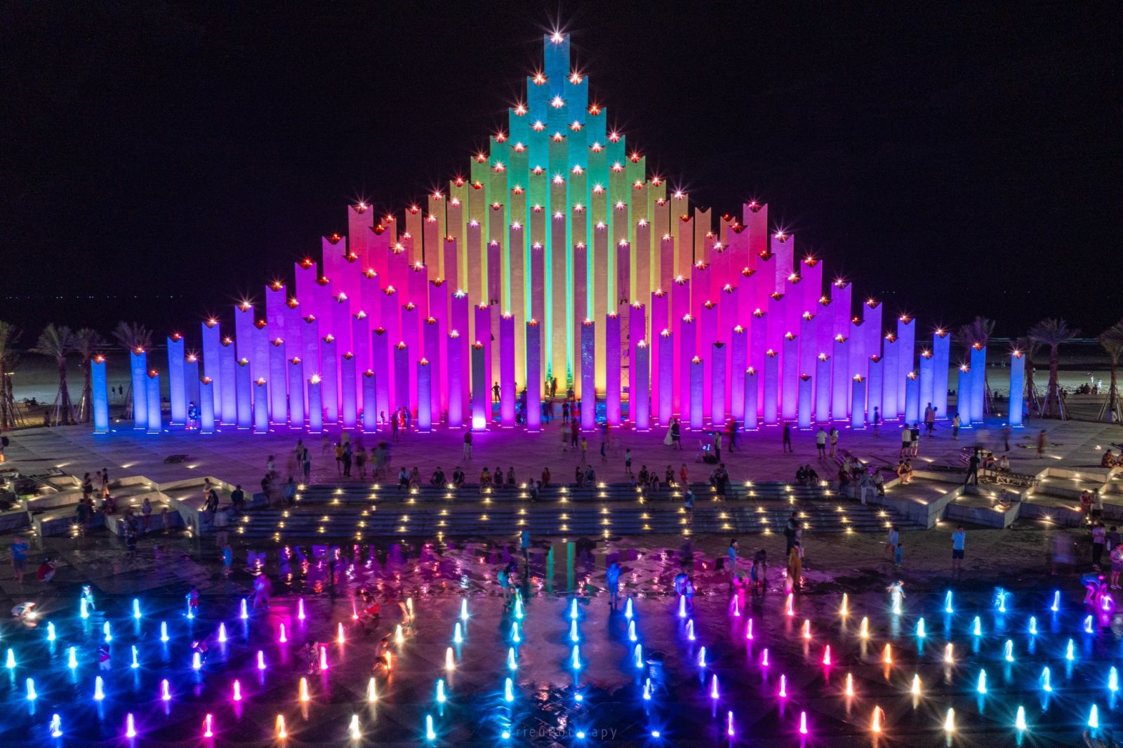 Buổi tối, quảng trường Tháp Tam Thắng càng trở nên sôi động nhờ chương trình trình diễn nhạc nước và ánh sáng LED. Nhiều nhóm bạn trẻ còn tái hiện các trend quay video TikTok, biến nơi đây thành “studio khổng lồ ngoài trời”.