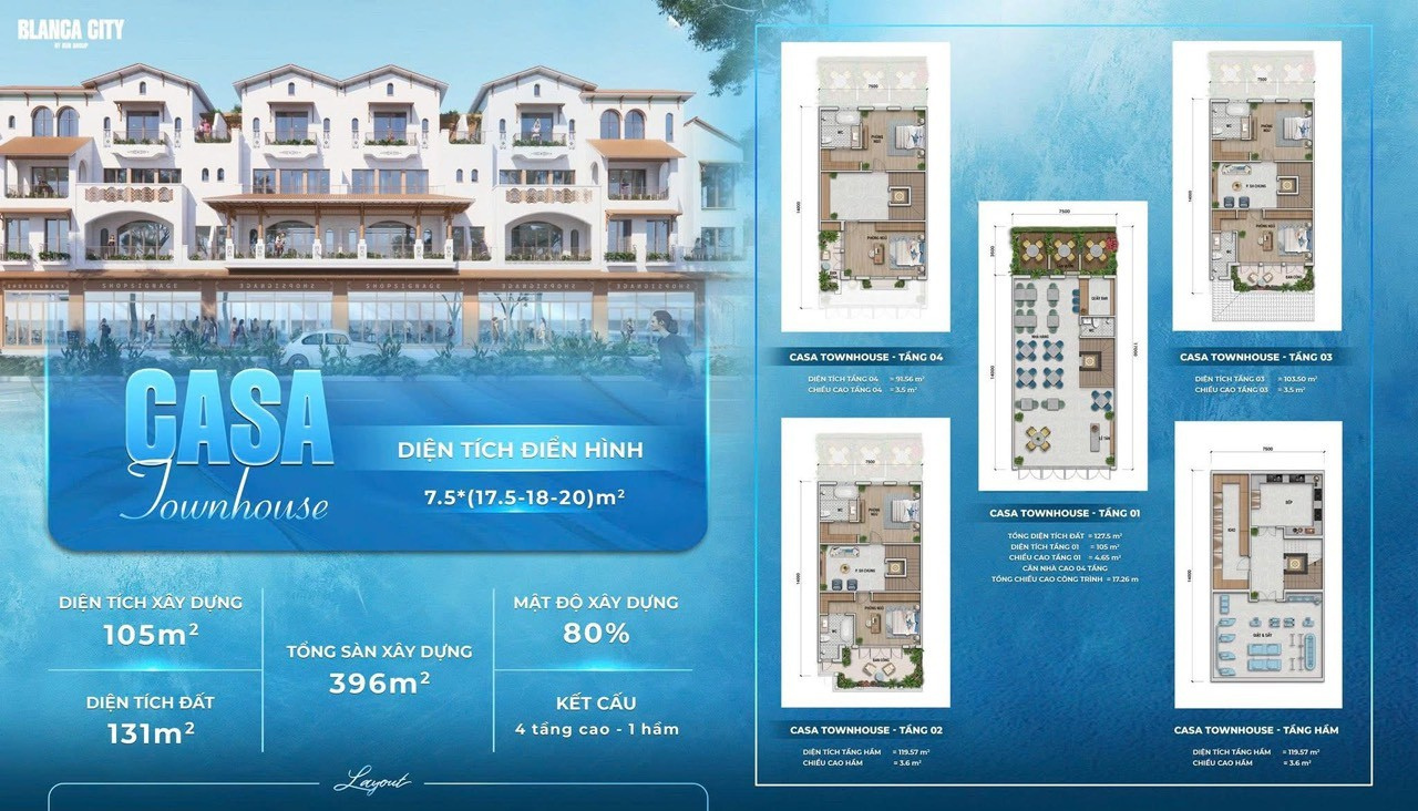 Với đặc trưng mặt tiền rộng, diện tích mỗi căn từ 131 – 150 m² (cụ thể: 7,5 ×17,5 m | 7,5 ×18 m | 7,5 ×20 m), Casa Townhouse có thể linh hoạt cho nhiều mô hình sử dụng kết hợp: nhà hàng, boutique, spa, café, mini-hotel tại tầng trệt và căn hộ dịch vụ cho thuê trên các tầng trên – giải pháp tích sản truyền đời cho các nhà đầu tư yêu thích bất động sản ven biển.